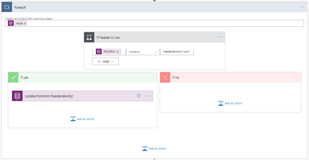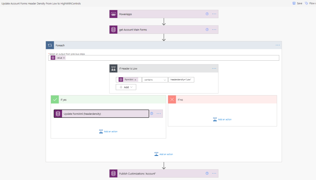 The flow that we are creating will update the “headerdensity” property from “Low” to “HighWithControls” for all account main forms. Trust me, it’s possible with Power Automate Cloud Flows !