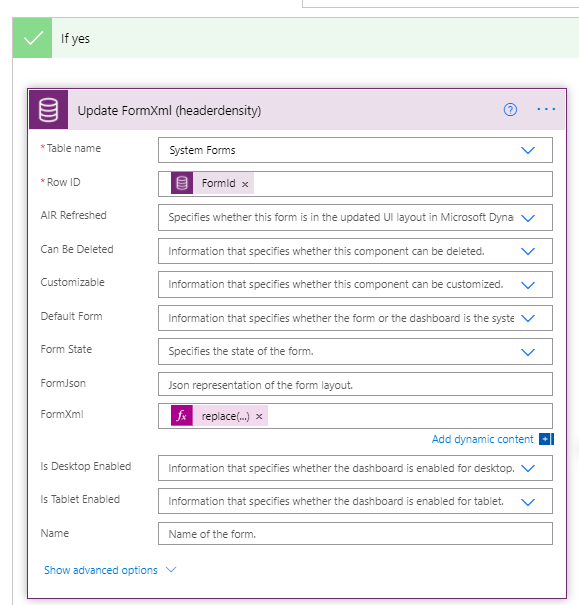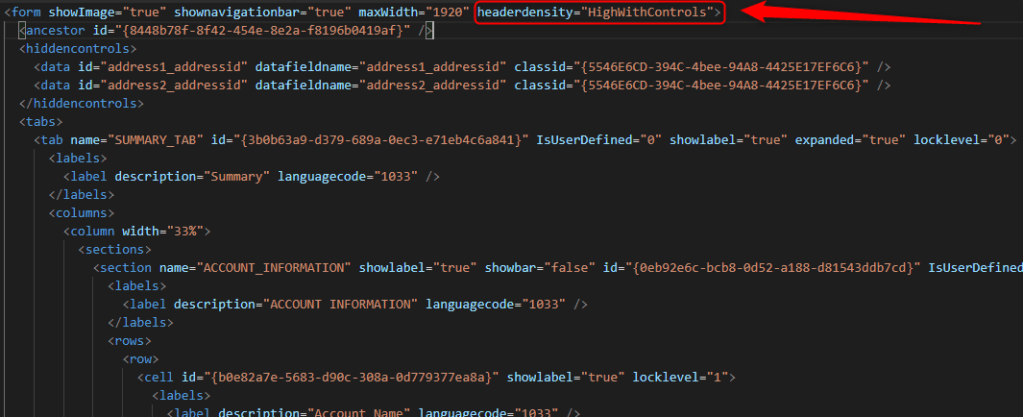 FormXml Expression: replace(items('Apply_to_each')?['formxml'],'headerdensity="Low"','headerdensity="HighWithControls"')Publish Account table Customizations