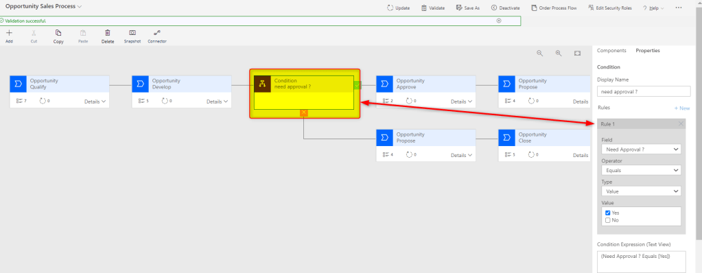 To illustrate these issues I will use the standard “Opportunity Sales Process” by adding a new phase named “Approve” where the user will go through this stage based on a given condition. This means that the user can go through the following two paths: