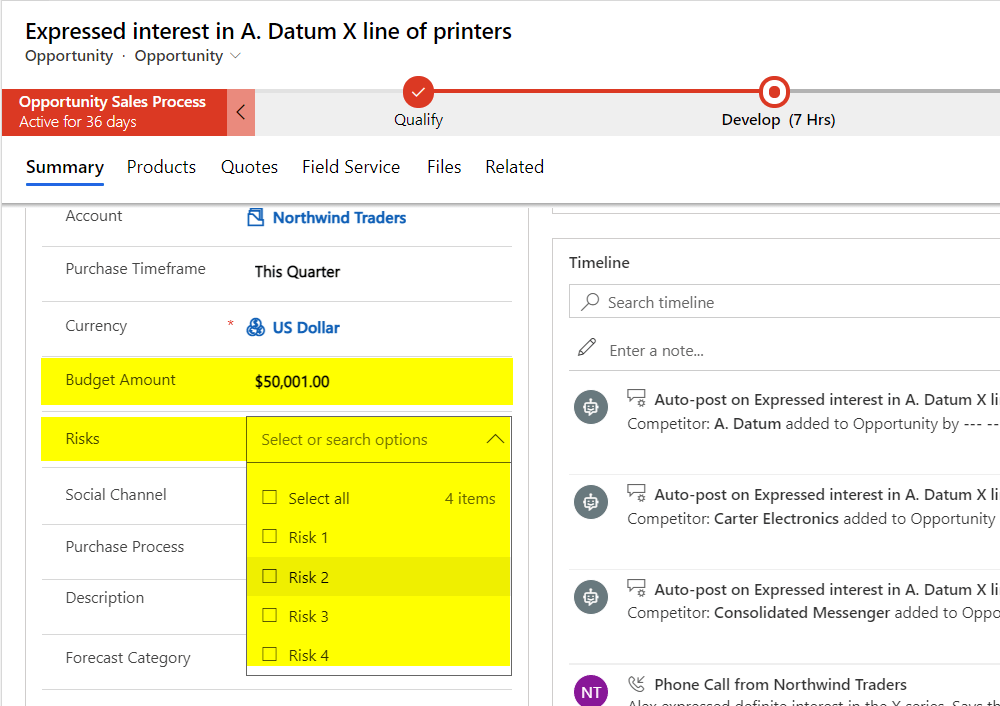 We will create a technical field (Yes/No) named “Need Approval” which will hold the result of (BUDGETAMOUNT >= 100000 OR (50000 <= BUDGETAMOUNT < 100000 AND (RISK = RISK 1 OR RISK = RISK 2)) which will be calculated using JavaScript Code.