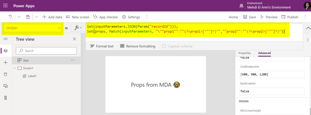 as indicated in the documentation of the navigateTo method for the “custom” type, we can retrieve the recordId parameter using the Param(“recordId”) function. As we have passed a JSON instead of a GUID, we will have to parse this JSON to extract the values of the different properties.