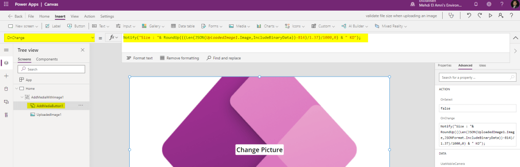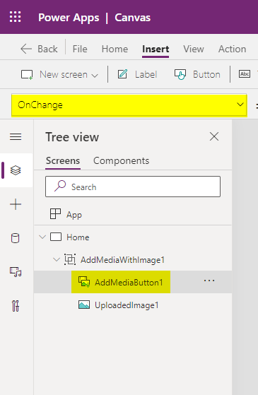 The Add picture control is used to load the picture from the user’s device. In fact, this control is a group of two controls. The sub-control we are interested in is “AddMediaButton“. Indeed, it contains the onChange property which will allow us to display the notification when the file is loaded.